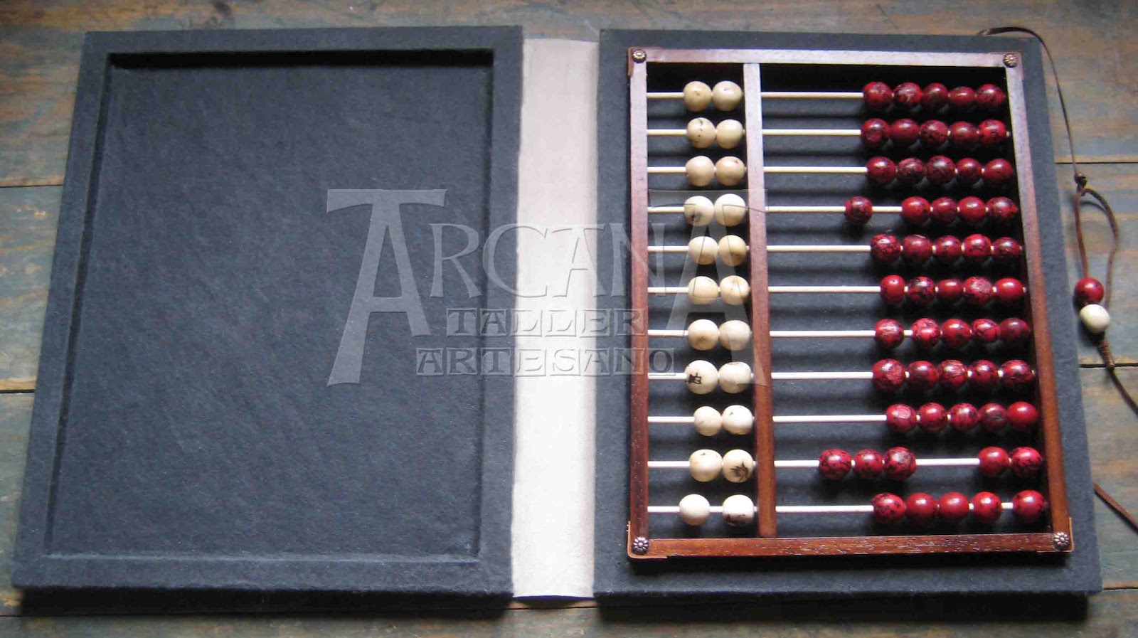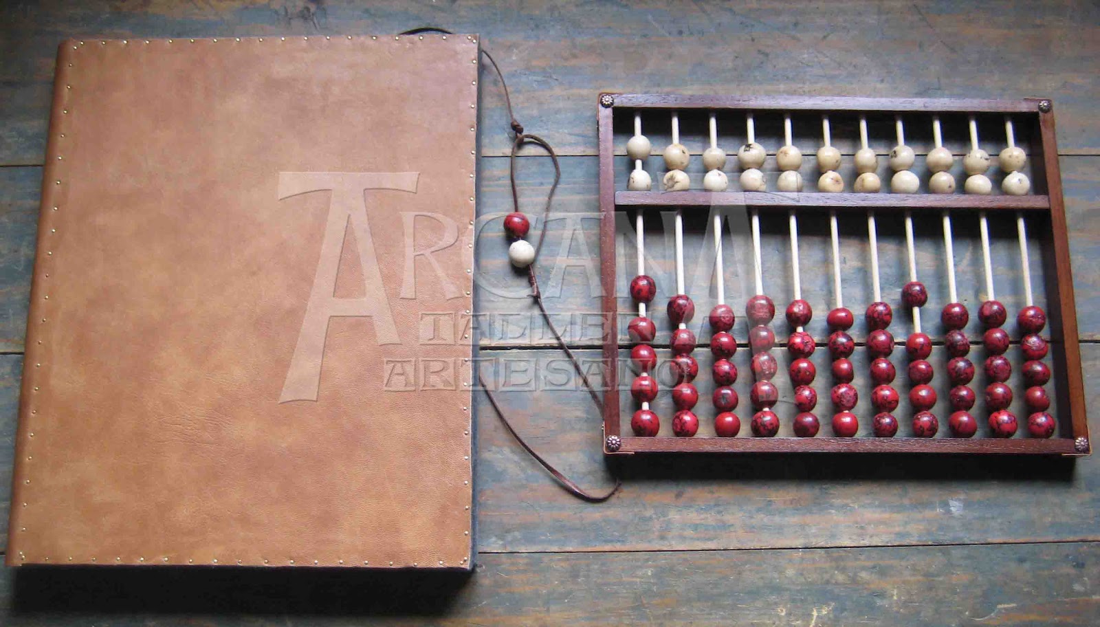 Ábaco realizado por encargo, según características requeridas por el cliente, elaborado en piel claveteada, madera maciza y semillas, en forma de libro, de 225x290x40 mm.
