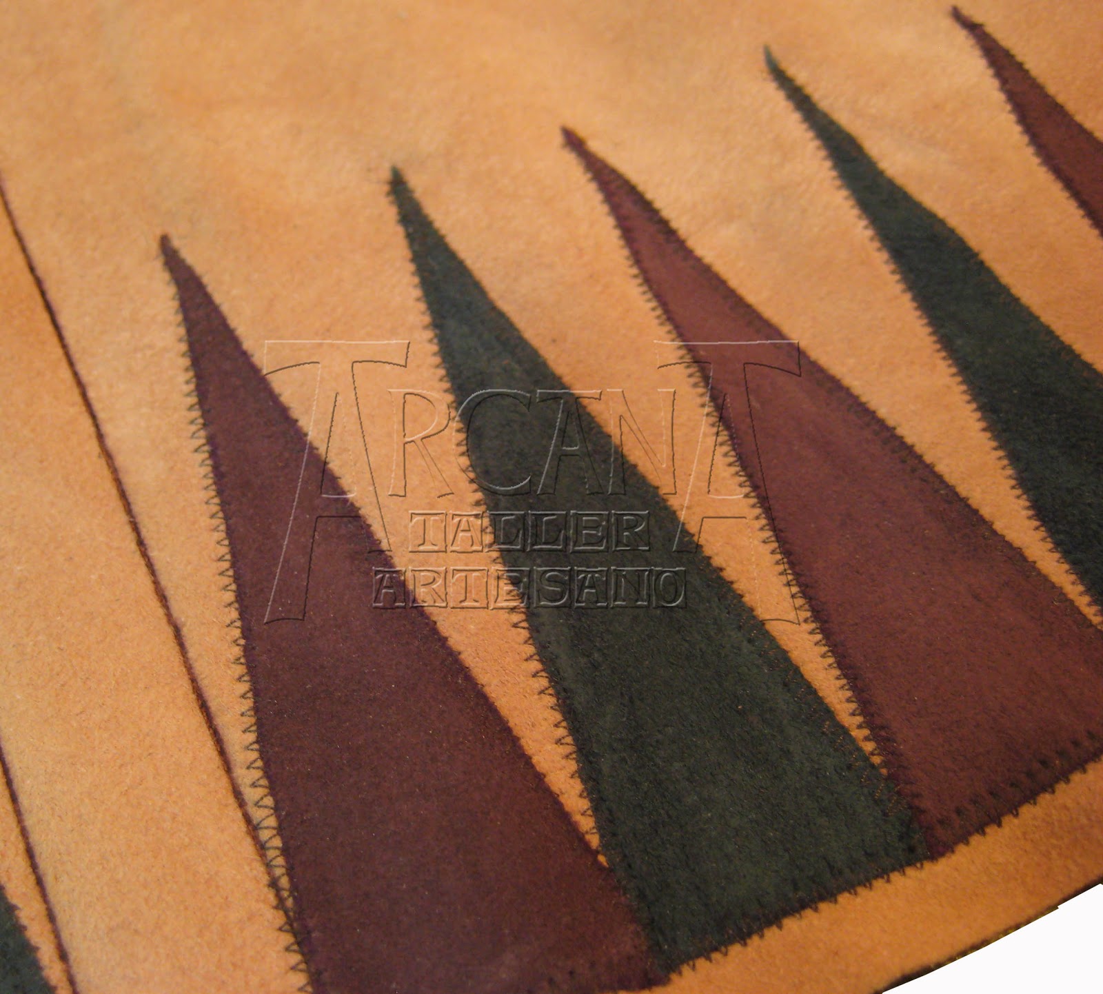 Modelo viaje: Tablero de piel bordada y pirograbada, de mm., con cubiletes en piel rígida y bolsa para transporte de fichas e instrucciones.
