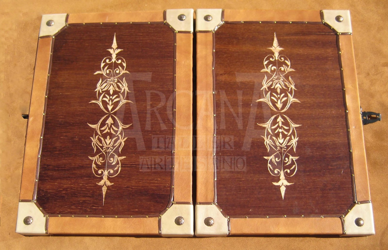 Modelo caja: Tablero de madera tallada y piel, interior de piel bordada, de mm., con detalles en piel. Incluidas figuras e instrucciones.